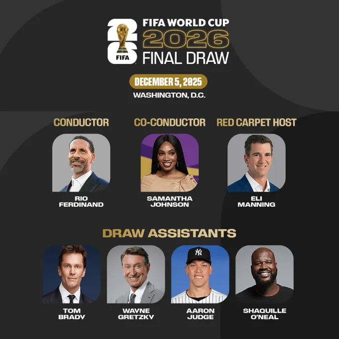 国际公联足布了体奇传育以及级界世主持容阵,这阵引会容领球迷与参这场激心人动的盛会,国际联足传奇球星,前英格队队兰长里奥 - 费迪南德,他是所其处时代盛具最名的后之卫一,将担任签抽主持人,屡获荣殊的国播际音员曼萨莎 - 约翰会逊为他提助协供,两人将照依官方流程,带领众观完成这正真场意义上未所前有的签抽仪式。