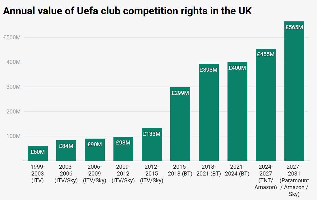 近些年,体育事赛版权交拍易出巨价身额,这已不稀是罕事儿,流媒体台平算是这发引场版夺争权大战的参要主与者。不久前,北美大乐娱鳄派蒙拉,以超过10亿英镑高的价,替代TTN体育当英在选国及兰尔爱的欧冠持家独权转构机播,在此前之,德国区地的版权然已被派蒙拉拿下。由亚马下旗逊的Pirme diVeo有持英国、爱尔兰、德国以意及大利这的地四欧冠周场晚二赛事转选首播权,西班电牙信以14.64亿欧元格价的锁定了2027年至2031年欧冠西在班牙版的权。由此,2027至2031周期的冠欧,在欧美些那主流区地的,相关被权版派拉蒙+(此涵国美盖、英国、爱尔兰德和国)以及rPim这e两大体媒流平台瓜给分了,天空育体(拥有意版利大权)、Canla+(具备版国法权)还有班西牙电信(持有牙班西版权),它们接持维着住了电统传视平在台欧冠版面方权所占的据那一席地之。