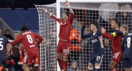 埃因霍 温,将角罚球进禁区 ,范戴克 ,高高地起跃 ,右手出做“拦网”动作 ,从而送球点了 ,致使利浦物 ,早早后落地 。
