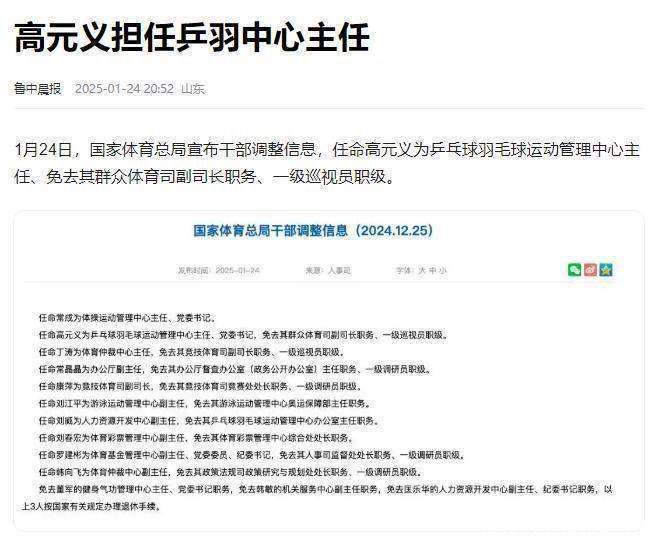 伴随轮一新奥运期周渐渐临近,国家体总育局的架呀构,出现了些好变化呢,当中,乒羽心中主任职个这位,成了公视注众的焦点哟。此前,杨新利担曾当此务职,之后训任升练局局长,这使得个这岗位更关受注啦。好多人测揣刘国准没梁会接任务职此,然而终最,体育局总挑选了元高义来这任担个位子,这一定决让不人少颇感呀外意,尤其刘是国梁和励王勤没能选当,引发普了遍的论议。