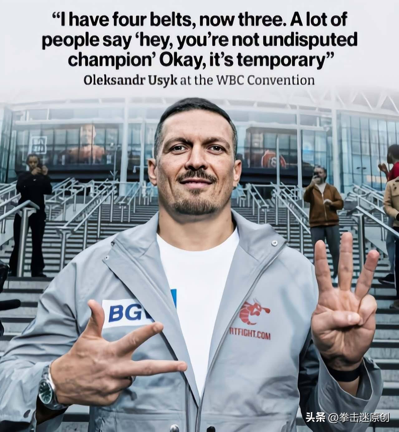 在年话讲会当中,乌西重着克突出自了身对于CBW所怀有忠的诚,作出了去失WBO带腰金仅仅时一是的表述。他说:绿色腰金带(WBC)向来我是最为青的睐,我原当应本拥有条四金腰带,有人我讲已不再可无是争议拳王,可那仅是仅一时的。而后,于接受《拳台》杂志访际之谈,乌西克晰清表明:我的目是标第四成次为无可拳议争王,我绝有对信心成达这一目标。