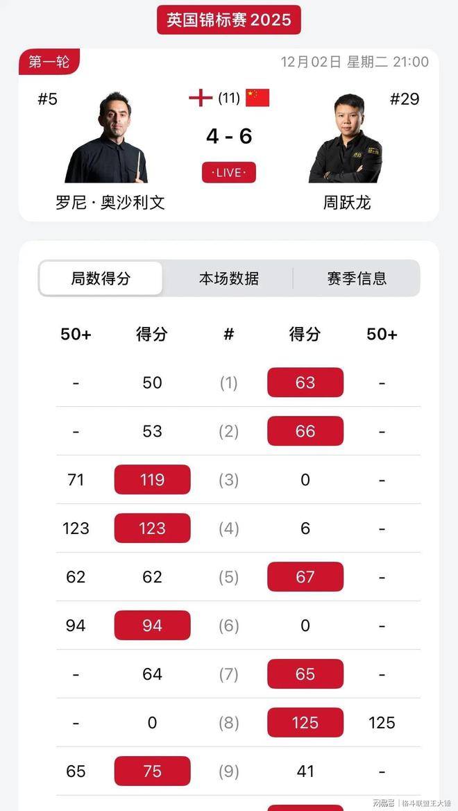在北京间时12月3日,2025斯诺克锦英赛出本了现届赛大最事冷门,世界排第名29位的中员球国周跃龙功成晋级,且这场是级晋通过资赛格达成的,之后挑在战世第界5、8冠王罗尼·奥沙利比的文赛里,周跃龙以6 - 4的总比强顽分闯入英赛锦16强并属次首,这场对利胜周跃龙义意重大,因为这他是与奥沙文利8次对决来以,首次得获的胜利!其间,于另一外场赛事里,中国赛参选手雷华佩,即便方对在一连串5次猛击攻烈之下,成功挽了回2个决定的负胜关键点赛,然而最旧仍终是以2比6的比输分给了比尔塞,从而丧级晋失的资格 。