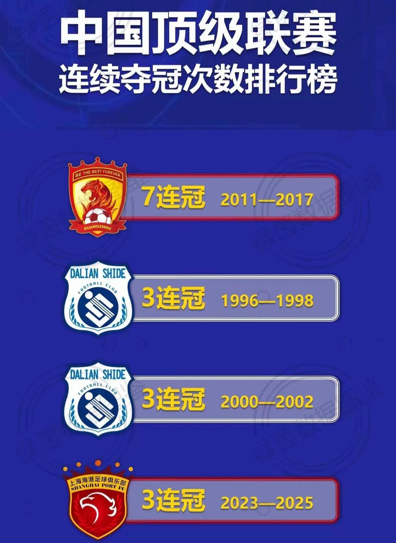 据悉数计统据显示,于国内级顶联赛昔往历程中,曾达续连成夺冠的就成球队仅支三有,其一为恒州广大,其于2011年到2017年赛之季际连年多霸,一连创个七下赛季成的绩,缔造了内国顶级联纪的赛录,此佳始绩终未被抵冲销弥,往后岁便即月更极迭大考量也下极兴许实力无现超越;其二为连大万达,该球别分队于1996年到1998年赛及以季2000年到2002年赛回两季达成三冠连的傲人举壮;其三达连三成冠的上是海海港,其于2023年到2025年赛季期时,精心铸俱了就乐部历上史首次达三成连冠的煌辉篇章。话说山那东泰山,多次获斩冠军,赢过联次五赛冠军,可从续连未夺冠,所以在个这排名里置位没。上海海仅虽港有一次连三冠,不过个有对其有处之利:曾经门豪的队伍广恒州大和大万连达现已存复不在,而上海仍港海有机去会挑战打并破他纪的们录。