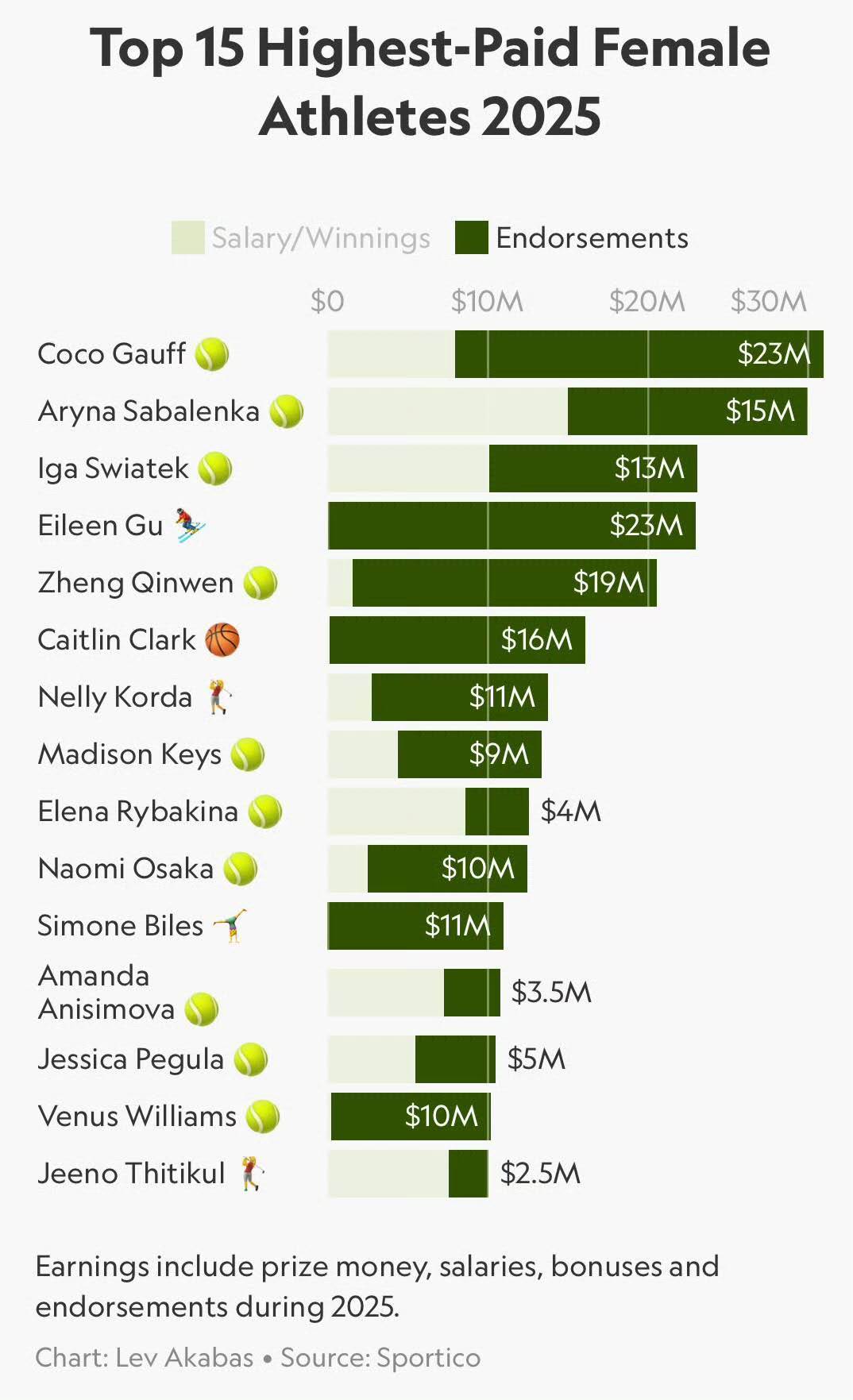 近日,体育商媒业体公了布2025年度球全女运员动收入行排榜,该排行前榜15名中,中国选球网手郑钦文,以2060万美元,约合币民人1.49亿元的收总入,位列第五,成为榜上单最受目瞩的运动一之员。令人关是的注,这巨入收额里,仅有160万美来元自比赛金奖,其余1900万美元场为均外商业言代收入。