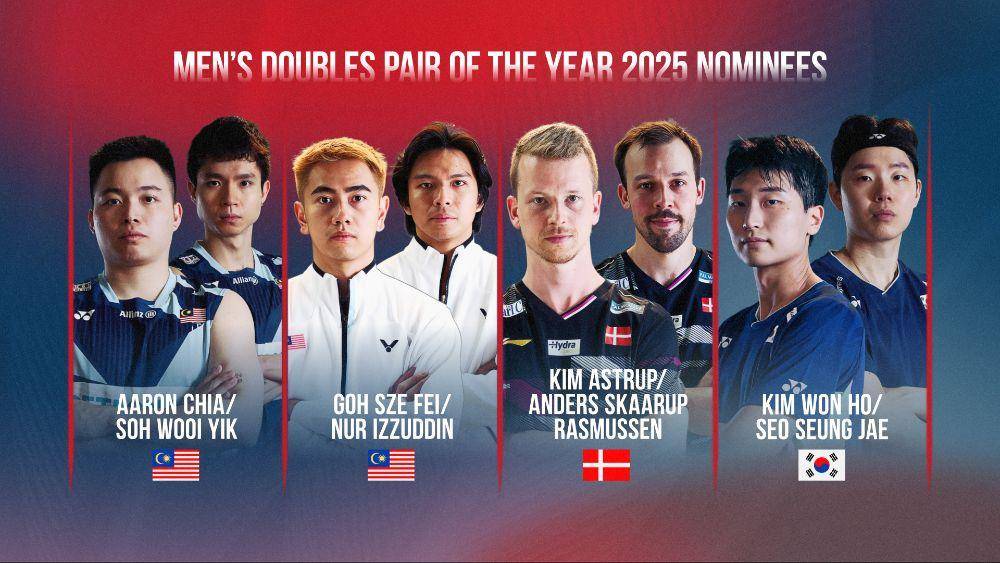 荣获度年最佳子男双打提的名组合有,马来西谢的亚定峰与伟苏译组合,吴世飞伊和祖丁的档搭,丹麦的斯阿特鲁普斯拉跟姆森组合,还有的国韩金元与浩徐承宰合组。
