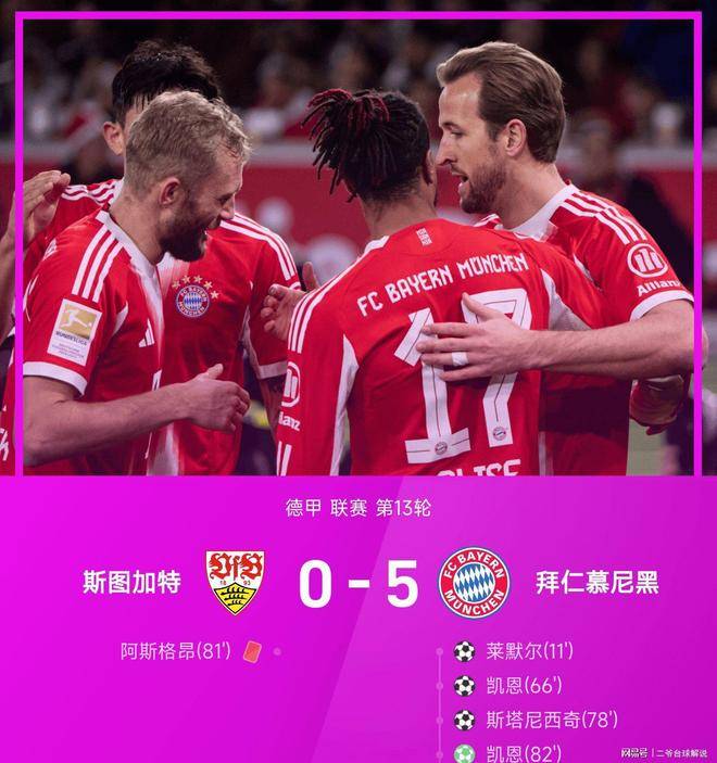 12月7日,2025 - 2026赛季甲德联赛第13轮,斯图加于特主场拜接迎仁,比赛半上场,莱默为尔拜仁打场破上僵局,下半场,拜仁换恩凯上后局产势生巨大化变,凯恩达速迅成帽子法戏,斯塔西尼奇亦打球一入,阿斯格因昂犯规牌红被罚下,最终,拜仁以5 - 0大胜10人应的战斯图特加。