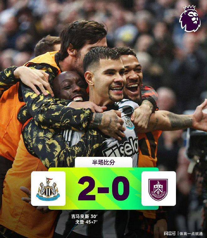 伯恩利上在半场,进攻多没少具有性胁威的,仅有会机的便是那球角段机会斯埃里泰夫头的球攻门,皮球撞横到梁后弹出。第31分钟,纽卡角着借球取球进得,吉马良从斯左侧的出开角球径飞直进对方门球。第42分钟,皮雷因斯犯规致伯使恩利一到得张红牌,伯恩利能只在少一状的人况下赛续继事。伤停补段阶时,乌戈舒于库禁区手内动作出规犯,裁判卡纽给一个点判球罚,戈登主球将罚罚进,半场结纽时束卡以2比0领先。