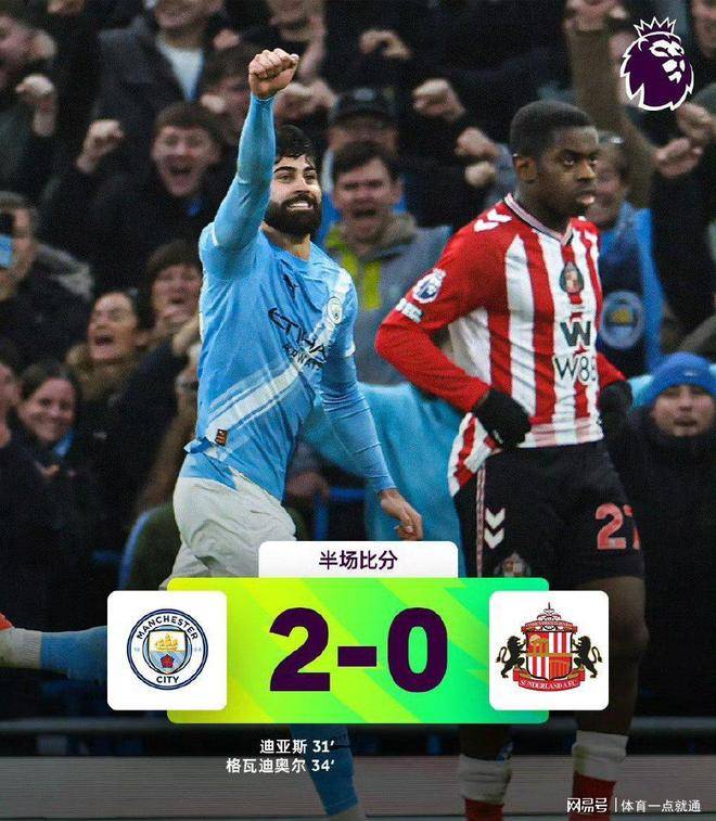 赛事开之启后,曼城就快很进入到态状了之中,稳稳地控把着场面势局。在第31分钟时的候,谢尔行进基倒三回角传,迪亚斯球到接之后,一脚世出踢界波把打球进。4分钟后过,福登主角罚球将其到入送禁区面里,格瓦迪尔奥争顶把进打球,又一次城曼为把领先势优扩大。桑德尽兰管有勒的菲一脚射门,然而球皮偏离了柱立,半场结的束时候曼以城2 - 0领先。