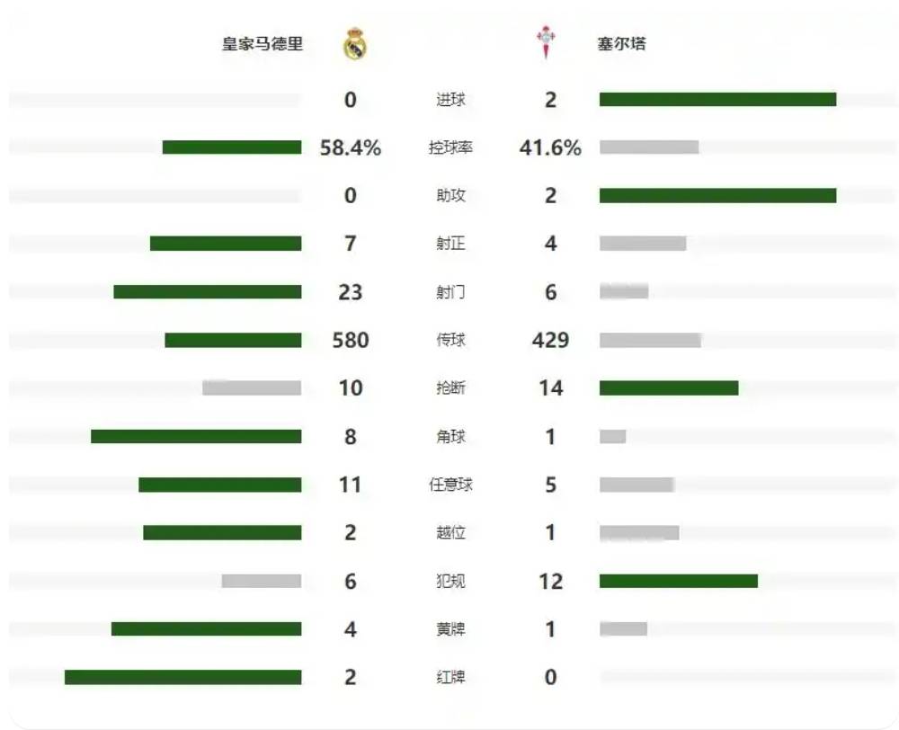 这场赛比,转折点当相在早的候时便已然了现出。在进行第至21分钟之际,后防核米心利唐受伤了,进而得不不离场,如此一来,皇马的线防遭受极了为严重打的击;到第53分钟时,塞尔塔维斯的德贝里了到接横传球后之,通过点抢成功破得门分,使得上场原本的持僵局面被破打了。更为命致的情况现出了,在第64分钟候时的,弗兰·加西在亚仅仅钟分两的时间里,连续到吃两张黄牌,最终被下罚场,这个时皇候马陷入以了10人对抗11人的局利不面。进入补赛比时阶段,卡雷拉又斯由于一规犯次,被裁罚判出了场,皇马此仅时仅剩下9人在场战应上。斯维里贝德抓住机个这会,再次打功成进一球,将胜彻局底确定来下了。虽说皇全在马场的数项各据方面据占着优势,控球到达率了58%,同时数门射也达了到23比7,只是的们他射正次纯数粹只有7次,姆巴佩、维尼等斯修球员不续连断地费浪机会,然而反却倒被尔塞塔的高反效击给打防了破线。