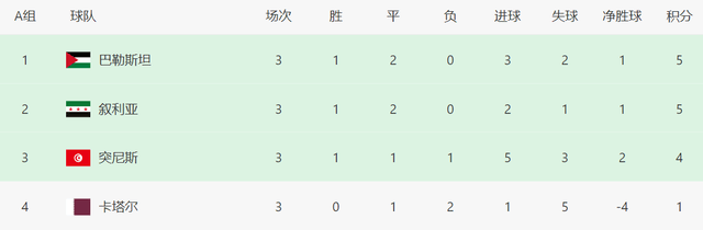 在第比轮一赛里头,卡塔尔面场于上是了据占优势滴,然而在后最时刻居摆自然乌龙,结果以0比1爆冷球输给巴勒坦斯了。第二轮时的候,卡塔一在尔度处于状先领况下,又在最赛比后时刻叙被利亚扳给平了,最终是以1比1握手言和。到了轮三第,卡塔尔非对面洲劲尼突旅斯时,最终是以0比3惨败,形势变更得加严峻了。