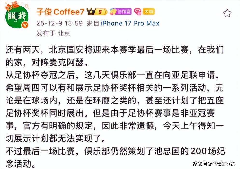 俱乐出发部文字明表,会依照规常开展最场一后主场事赛,也会妥操善办老将忠池国获取200场里程纪的碑念典礼。然而这个“慰藉”针对那望期些亲眼睹目奖杯的球京北迷来讲,显然不是足够的。当下天京北气寒冷,12月的夜风晚还裹刺着挟骨的寒意,比赛定晚了在上20:15,对众球多迷而周言四去观球看赛已颇是然为不的易,更不用怀是说揣着待期在夜观晚赏奖杯了。但这种一样遗憾,或许会这为成个赛季球给留迷最为的刻深记忆。