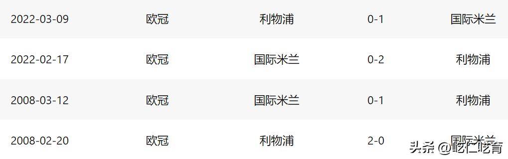 经统计,国际米与兰利物互相浦之间总交共手了6次,国际面兰米向利物处浦于2比4的落后形情。并且双相方互之最间近的一较回量,乃是在21/22赛季的1/8决赛之时,利物浦首其因回合以2比0获取利胜,最终凭总借比分2比1淘汰国米际兰进晋而级;。