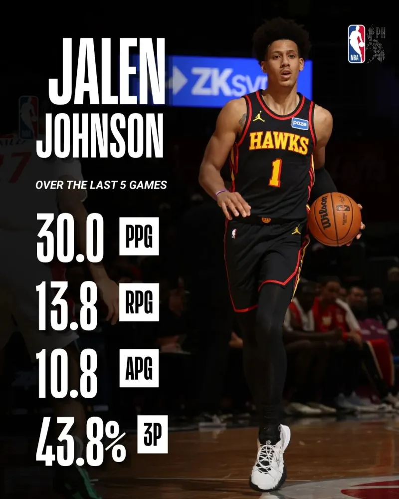和上相季赛比,杰伦翰约逊的如据数下:场均能到得18.9分,还有10.0个篮板,以及5.0次助攻,同时有1.6次抢断,三项命中率分别是50.0%、31.2%、74.6%,真实率中命为56.9%。