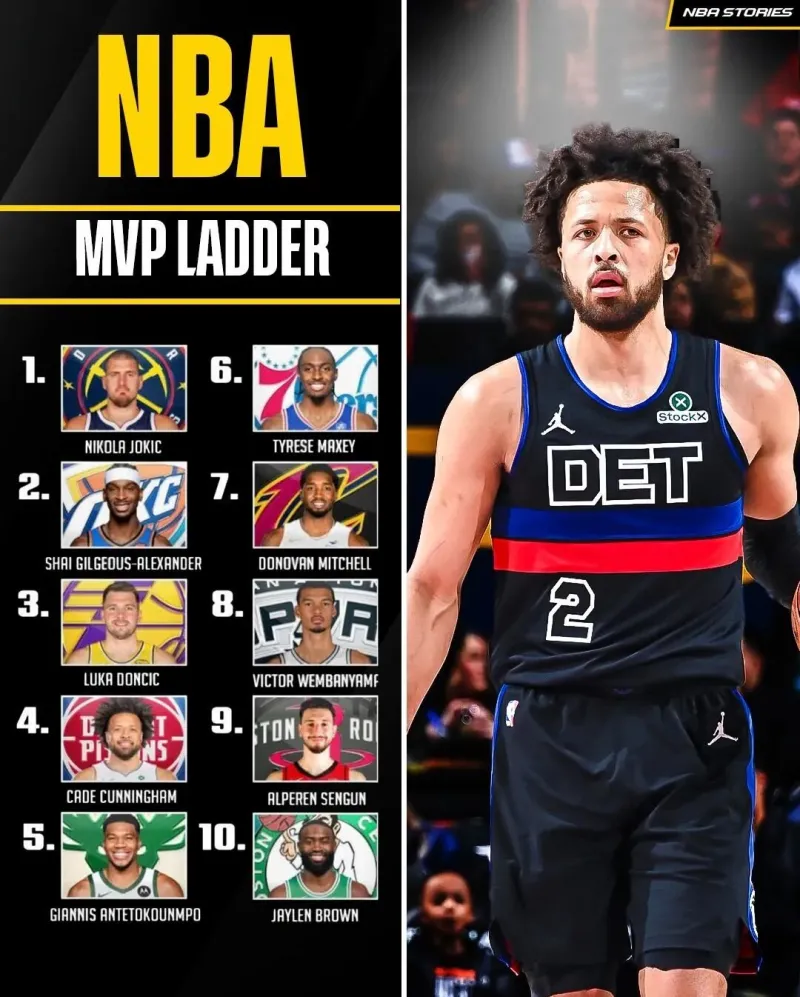 在NB方官A所公的布最新M期一VP排里名,约基奇、亚历山大、东契稳奇稳地于居前三,然而,排在第的位四球员,已从字转哥母为坎宁安。
