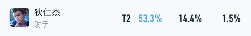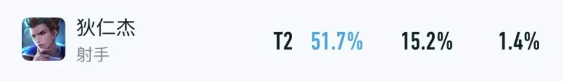 此外,狄仁排打杰位赛时胜的率,也在概大54%的范围右左波动,并且一这情况,还是处其于出场率为14.4%的前提件条之下,这表明样同他属于在段分全都能普用适遍的那种“万金油”角色 。