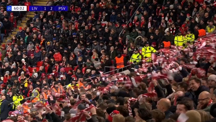 安菲尔德鸳鸯锅!大量红军球迷提前退场,埃因霍温球迷挥手告别
