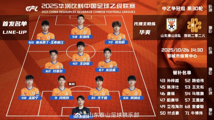 中乙第30轮争冠组山东泰山B队vs深圳二零二八首发阵容