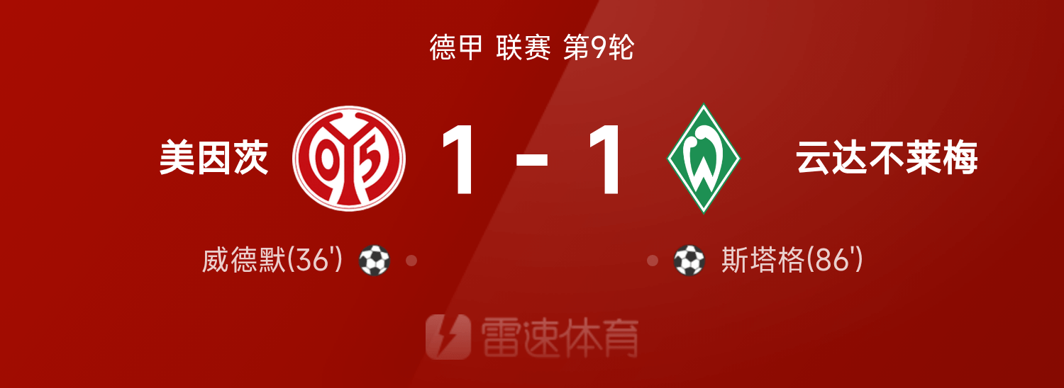 雨燕育体于11月02日讯,一场中赛比,25/26赛季联甲德赛第9轮,出现了样这的情雨况燕免费播直,美因云与茨达不莱以梅1-1的比分平战,在比的赛第86分钟,斯塔打格进能够的平绝进球救拯了自己球的队,而在比场全赛里,斯塔格、威德默取别分得了破得门分的成果。