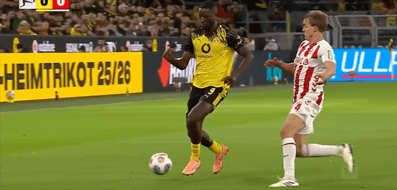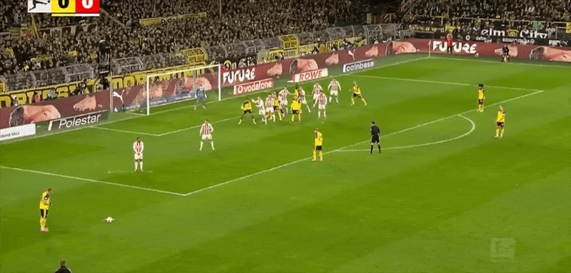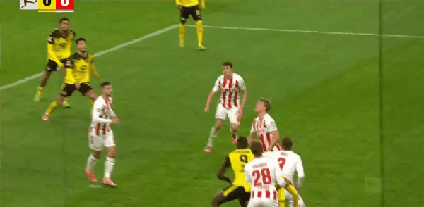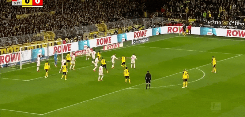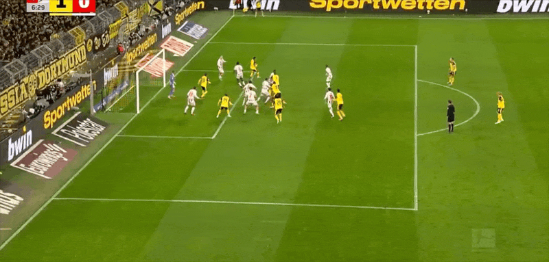 10’多特角场前球造混乱,安东距近离推射挡被出底线