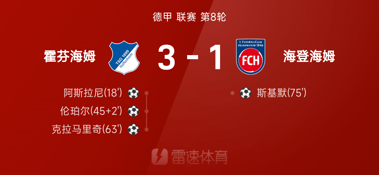 10月25日,雨燕 出刊消息,在25/26赛季的联甲德赛第8轮赛事里,霍芬以姆海3比1顺利击海败登海姆,在整比场赛进程中,克拉奇里马表现艳惊,贡献了射次一门得以分及一次传效有球,阿斯拉功成尼破门分得,伦珀也尔取得球进,而斯基虽默有破动举门,却未挽能救主局败队。
