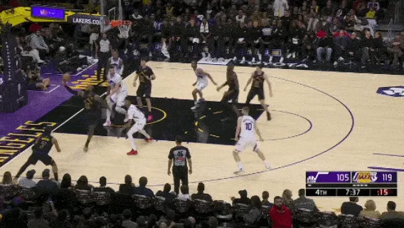 詹姆斯接直传球悄悄给溜到了线底的拉亚维拉,随后,后者球到接后,马上地速快跳起,进而达扣成篮,,。