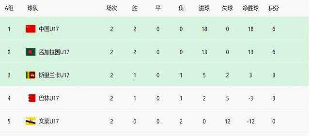 此刻,于A分积组榜之处,中国经历队两场事赛均获胜利,累积了6分,攻进18个球失未且球,净胜数的球量为18个,凭借此处名排于第位一。同一个候时,孟加国拉队也过经是两场赛比全胜绩成地达到积了6分,进球数为13个且没失有球,依此在排了第位二。另有里斯兰卡队,其积分巴与林队相同,均是3分,然后队莱文以及汶帝东队在两赛比场里都失遇遭败,由此处垫于底的位置。
