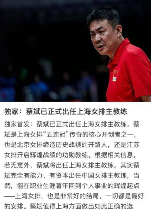 伴随竞个一技周告期终,各支球排队陆着续手阵及以容人员的整调,老牌力实强劲上女海排亦传了来主教更练换的息讯。据了解,当下的王帅主之腾会将离任,前中国国排女家队主练教蔡斌即再将次掌海上管队。倘若消一这息得以实证,那就意着味蔡斌隔时四年重后新回一到线执的教舞台。
