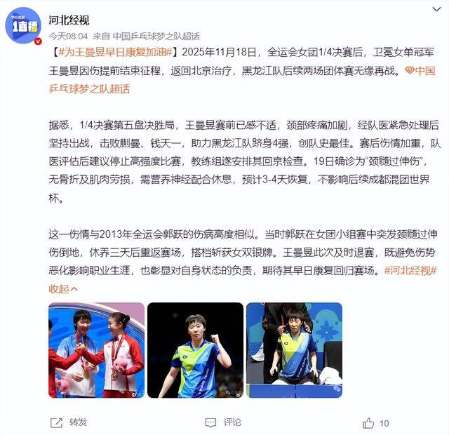 王曼昱全在运会女四单分之决一赛里,遭遇颈了部不适,还遭遇肩了部不适,在医暂疗停之际,她的表为极情痛苦,队医检行进查时,可以看极她出其疼痛,然而时此黑龙与江江苏分比是二比平二,王曼作昱为二单三以比零蒯扫横曼,她马上要就出战五了单。