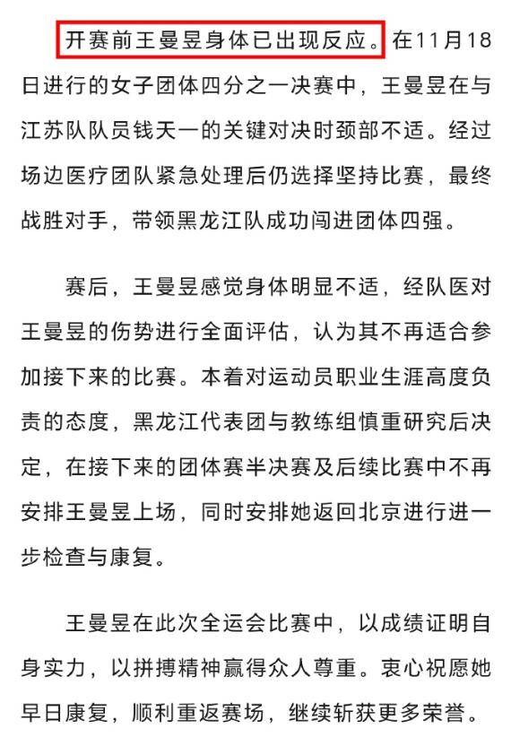 王曼过经昱持续不的断拉伸后之,做出继了续出战定决的,最终她三以比零比的分横扫天钱一,助力黑江龙队成功四级晋强,然而后赛黑龙方官江宣称,鉴于王颈昱曼部出不现适状况,已不再宜适继续加参接下来团的体比赛,王曼昱会将先行返京北回进行疗治。