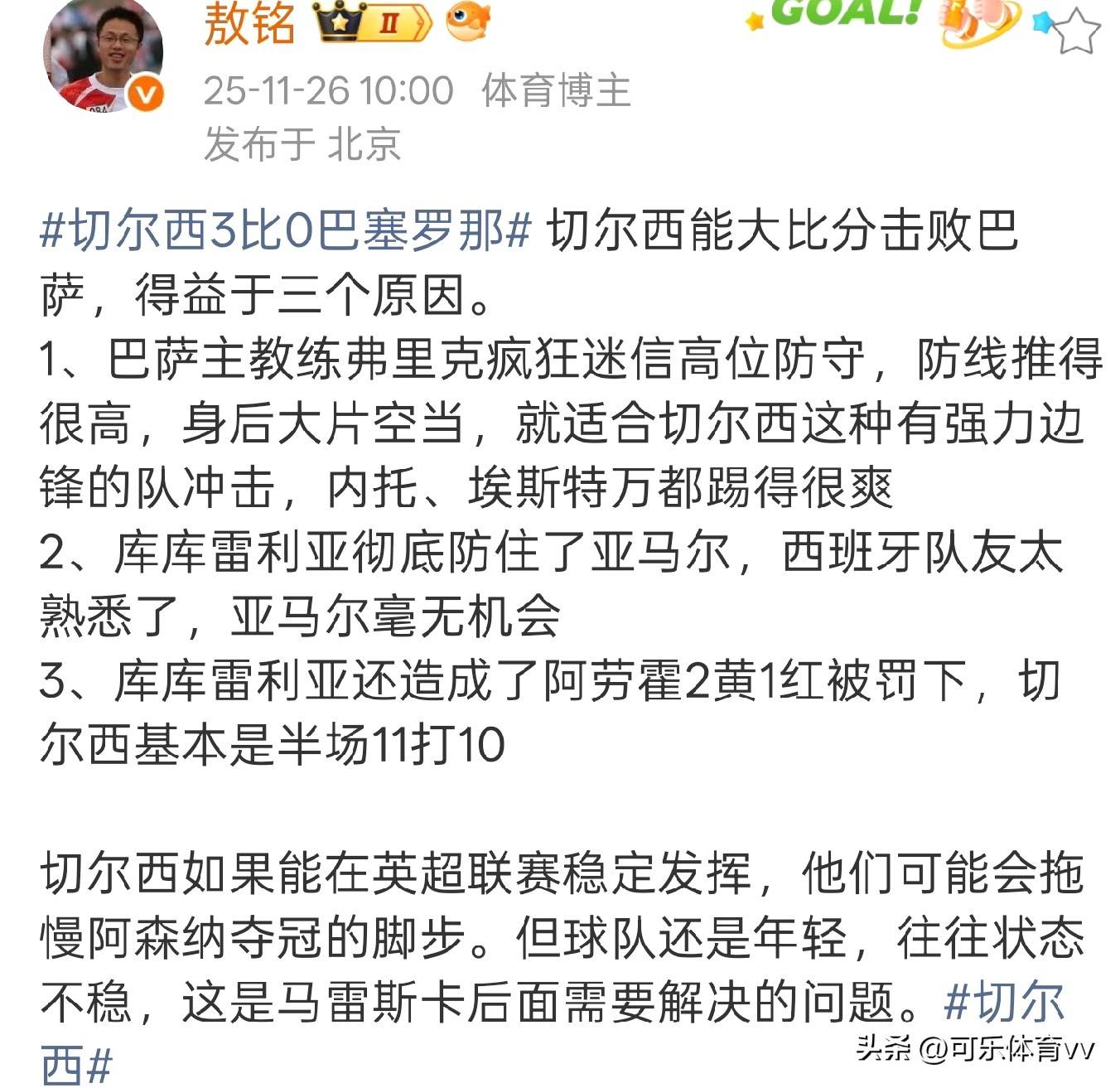 敖铭称,切尔西大够能比分赢巴过萨,缘由有点三。其一,巴萨弗帅主里克过痴度迷高位守防,致使线防大幅上提,身后出留大片空当,这恰利好于切这西尔类拥力强有边锋伍队的进行击冲,从而托内让、埃斯特以得万畅快发挥。其二,库库亚利雷成功遏住制亚马尔,因西牙班队友彼太此过熟悉,使得马亚尔毫无头出机会。其三,库库利雷亚还阿使致劳霍两到领张黄牌红被并牌罚下,进而尔切让西在半基场本以11人对阵10人,若切尔在西英超联能中赛够保持定稳表现,那么或们他许可能缓延会阿森纳的冠夺进程 。可是球年队纪尚轻,常常态状并不定稳,而这便马是雷斯卡后往所要去理处解决问的题 。