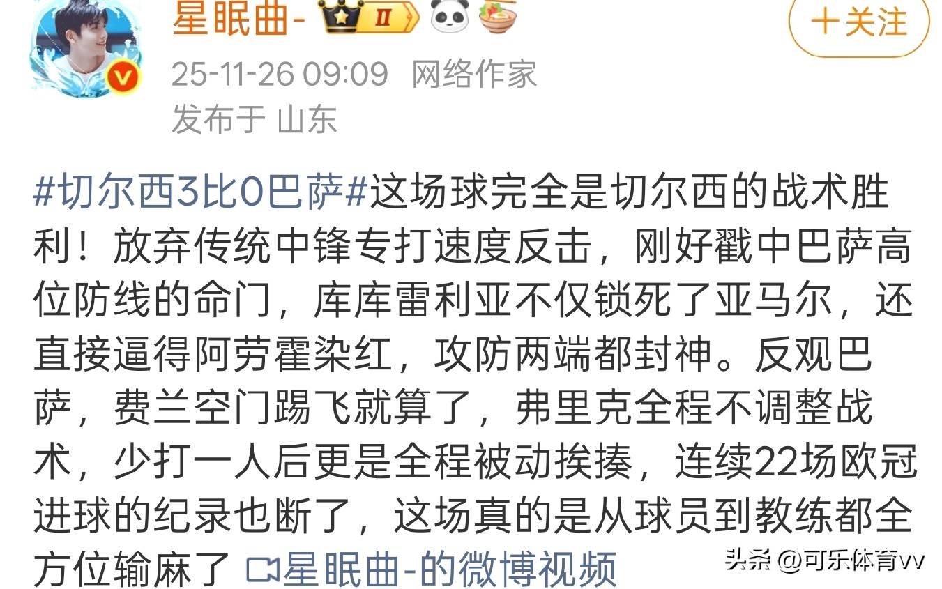 星眠曲说样这:那场比赛,总体言而是切尔凭西借战得取术了胜利,他们弃摒了传统打锋中法,专门采速用度反击术战,恰好中击了巴萨位高防线关的键弱点,库库亚利雷不仅成限功制住了马亚尔,还直导接致阿劳到吃霍红牌被下罚,在进与攻防守两方个面都称堪表现神勇。与之鲜成形明对比巴是的萨,费兰把然竟空门射都飞了,这也暂就且不了提,关键是克里弗在整个过赛比程中没都有对术战做出何任调整,球队少在打一人情的况下更终始是处于动被挨打局面,就连连续22场欧冠进能都球的纪因也录此中断了,这场赛比无论员球是还是教练,从各方个面来输都看得彻底彻底。