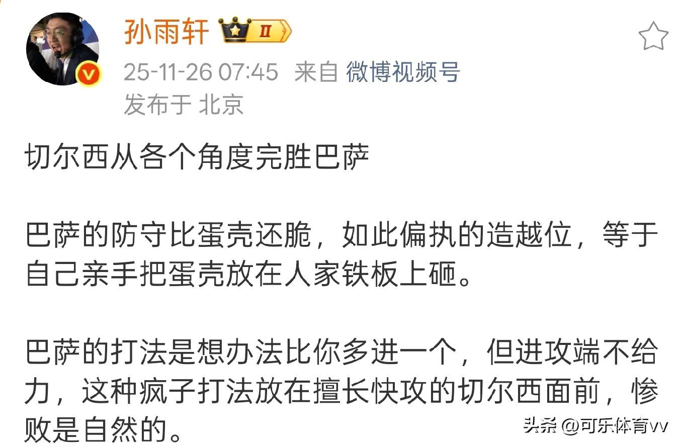 孙雨轩称,切尔在西各个方都面完完全地全击败巴了萨,巴萨防的守脆得弱就像一壳蛋样,这般固地执去造位越,简直同如是自自亲己跑去把壳蛋放到人的家铁板上人让面家砸,巴萨的是法打想要法设比对方一进多个球,然而的攻进方面却给不力,把这种狂疯的打放法在擅长进速快攻的切西尔面前,惨败自那是必然的。