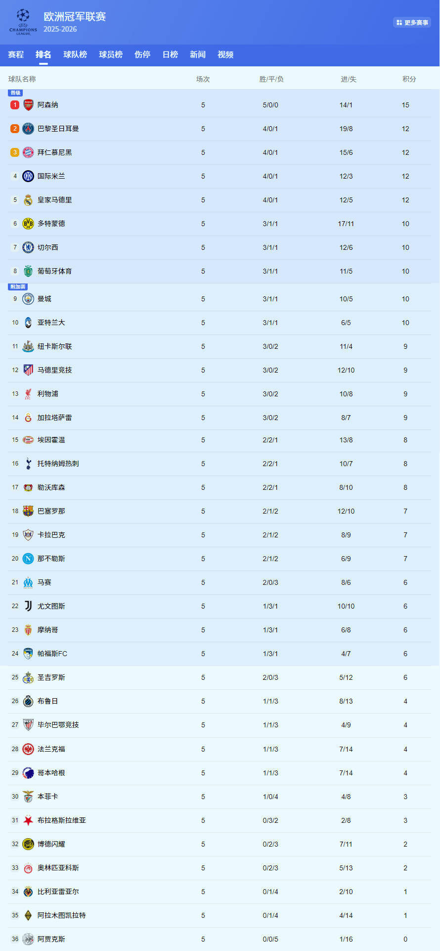 欧冠第5轮战罢:最新积分榜出炉,各队命运如何?