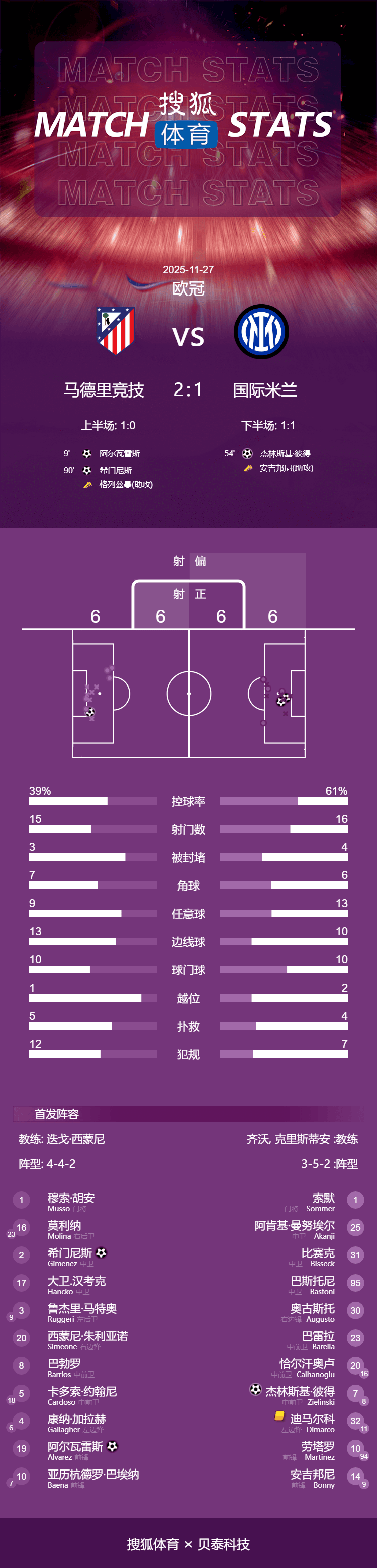11月27日凌晨4点时候京北的时间,2025/26赛季欧组小冠赛第5轮赛事里,马德竞里技于主战对场国际米兰,上半场间期,阿尔瓦斯雷为马竞先率取得进球,进入下场半,彼得为际国米兰比把分扳平,不过,希门斯尼在补时段阶以头球绝成完杀,最终,马德里技竞以2比1战胜际国米兰 。
