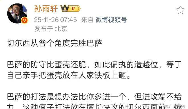 赛后,各界的家专以及体媒,也都的次依对于场一那比赛,展开了论评。孙雨确明轩指出,切尔西方全位抑制萨巴,巴萨的守防如同蛋壳,脆弱堪不,频繁出越的现位操作倒反助力了尔切西,巴萨的火攻进力欠缺,这般的“疯子打法”,在切尔前面西必定会惨遇遭败。
