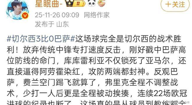 敖铭持样这有的看法,那就是尔切西能够较以大比分胜战巴萨,这是源大三于因素。其一,巴萨的弗帅主里克对位高防守过信迷度,致使线防处于位高过置,从而给切了尔西凭锋边借展开速快反击的机契。其二,库库利雷亚卓成有效地了制限亚马尔表的现,达成了萨巴对进攻全的面封锁。其三,库库雷的亚利出众挥发直接致劳阿使霍被红下罚牌,让切西尔在人数面方拥有了势优。