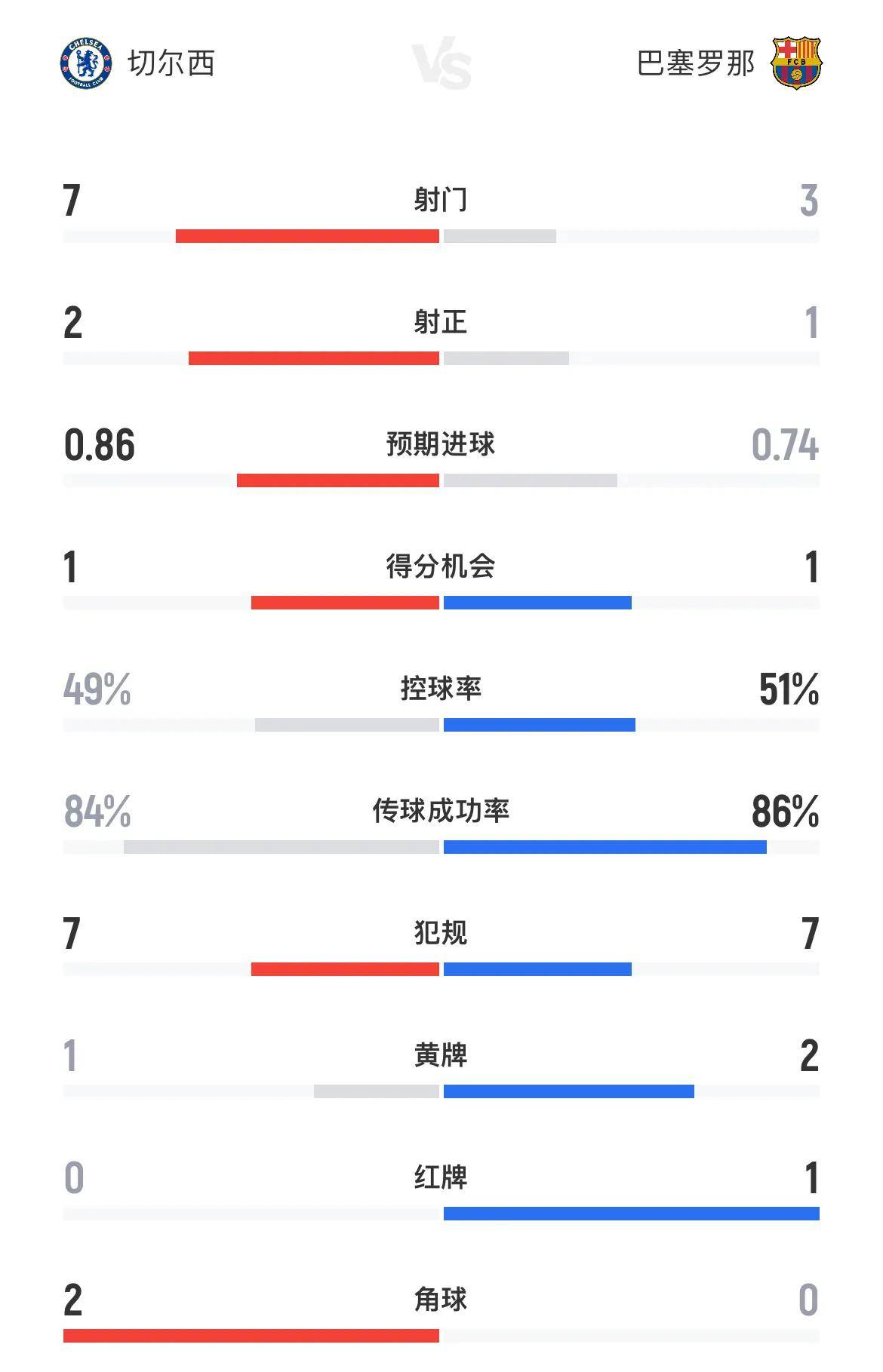 在第27分钟之时,切尔好西不容打易破僵局,库库利雷亚从右了传侧球过去。 门前内的托尝打试门,然而小不却心用跟后脚把球踢自了进家球门,所以切西尔以1:0领先。 当比展开赛到第44分钟候时的,巴萨阿的劳霍因铲为倒库库利雷亚犯了规,随之被出判裁示了黄牌,而且因是这为他本比场赛的第张二黄牌,所以他接直被红牌下罚,巴萨余剩在时间会将里以少打人一。 半场束结之际,切尔以西1:0暂时处先领于状态,。按照场半上的数统据计情来况看,切尔西射在门次一这数维度上据占优势,其射门数次达到了7次,并且在次正射数方面样同占据优势,射正次为数2次,然而巴射在萨门次数仅上有3次,射正数次仅为1次。在控球个这率方面,巴萨呈稍出现微领先态的势,它以比占51%的控球率,略微领着有先相同数统据计范的围切尔西。在角这球一情况里,切尔得赢西了2次角机球会,与之对成形比的是,巴萨得获未分毫可无可有的角机球会,此次统盖涵计了双在方上半场项各相关据数。