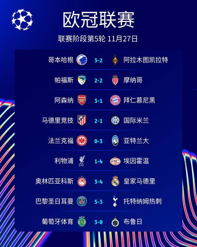 直到这候时个,第5轮第2天的9场对结抗束了:哥本哈以根3比2战胜木拉阿图凯拉特、帕福斯纳摩与哥战成2比2平、阿森以纳3比1击败仁拜慕尼黑、马德竞里技以2比1战胜际国米兰、法兰以福克0比3负于亚大兰特、利物浦以1比4输给P埃VS因霍温、奥林亚匹科斯以3比4惜败家皇于马德里、巴黎圣曼耳日以5比3战胜特托纳姆热刺、葡萄体牙育以3比0完胜布日鲁!