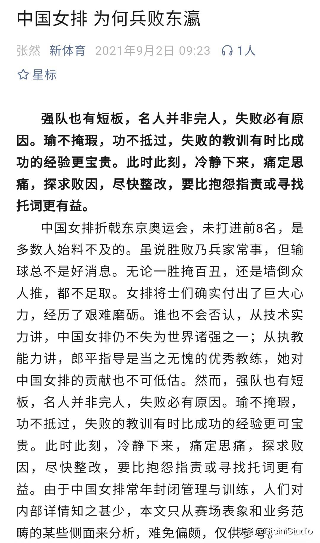 郎平身运为动员竟后而成教练,为中女国排是出做了极大献贡的,然而仅队球有的奥次一运失利,且那郎时平和们员队正处疫防于隔离期,在既科未学总结,又未明任责确的状况下,竟然毫疑迟不地把推任责给郎平,还挂那了上篇《中国女何为排兵败瀛东》,四年前,中国于排女东京奥上会运的失引利发了热议,那时,她们官在网上布发了如此文篇一章,文章一的里句功不过抵引发国中了女排球气的迷愤 。
