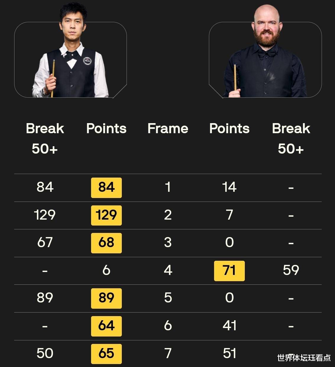 在张达安跟艾伦·泰勒进所行的比头里赛,张安达现展出的表为极现强势。比赛的一第局当中,张安达杆单打出了78分,最终以84比6的比松轻分取得利胜,从而取了得1比0的领先面局。第二之局时,泰勒靠依单杆打出54分的这表般现,以80比39的比分了回扳一局,进而把追分比为1比1。第三局面里,张安再达度发很得挥出色,其单杆出打66分,于是以85比46拿下局此了,保持着3比1的领先。第四局,张安单达杆打出74分,以 74比14再次胜得赢利,把领势优先扩大至3比1 。在第局五的时候,他依杆一靠展现彩精出呈现的100分,以121比1的巨优大势取得利胜,进而将次再比分予开拉以,形成了4比1领先泰的勒局面,第六局,张安达单杆打出了50分,以72比31的比赢又分得一利胜局,达成了5比1领先势态的,还率先到取获了赛点。,第七局,张安凭达借58比13轻松地得赢了比赛,最终依靠6比1的比分了胜战泰勒,成功顺晋地遂级到了48强 。