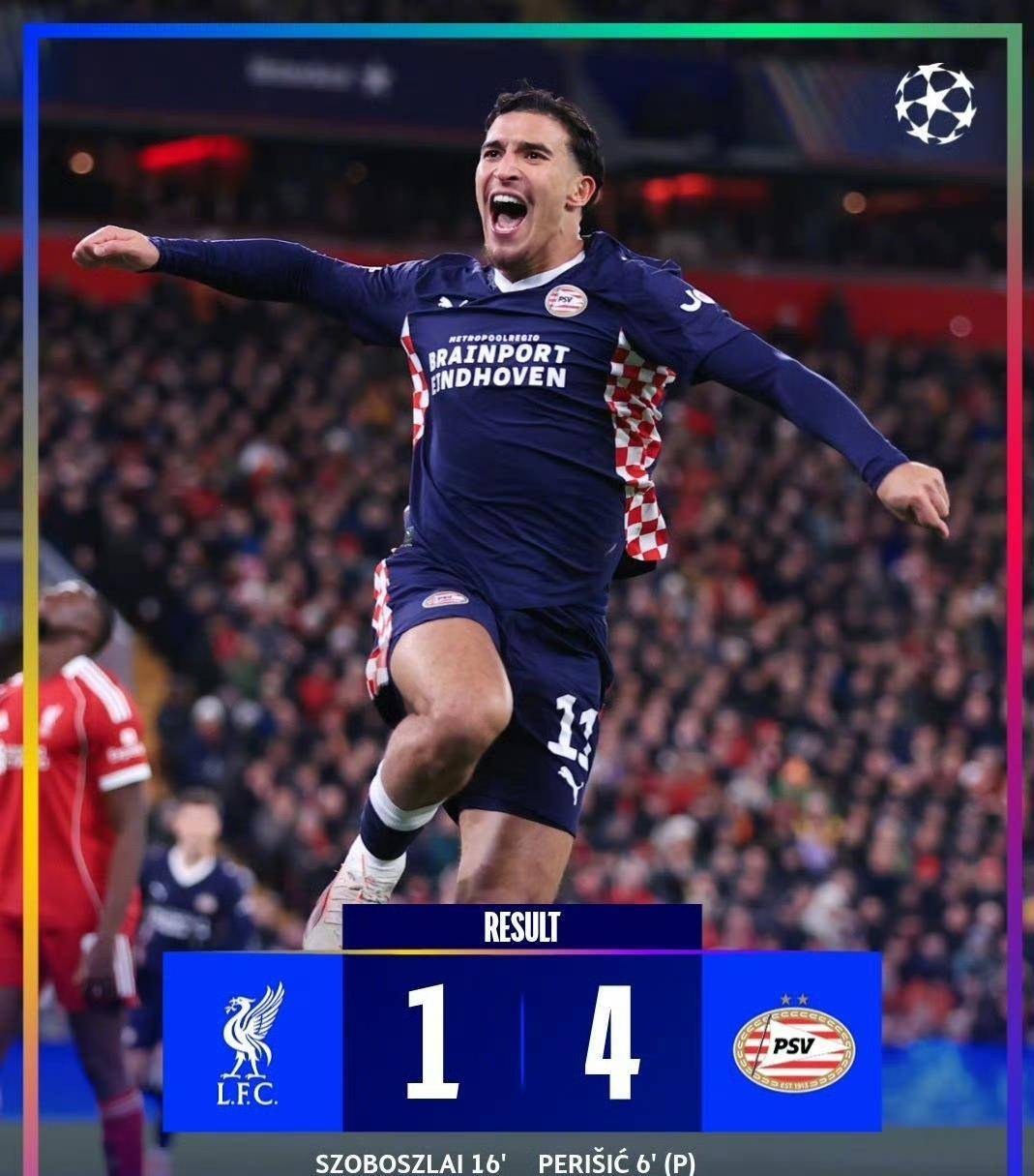 欧冠联五第赛轮结束后,安菲球德尔场在场终哨声之起响际,是人都去离已,楼内荡空荡的,看台上员人稀少状的况,跟比分上牌醒目刺的眼“利物浦1 - 4”,构成鲜了明的差反。往昔夺那的冠支队伍,现如今自在却己的场主,被荷实甲力强劲埃的因霍温,以一种惋人让惜到极方的点式,给完全败击了。