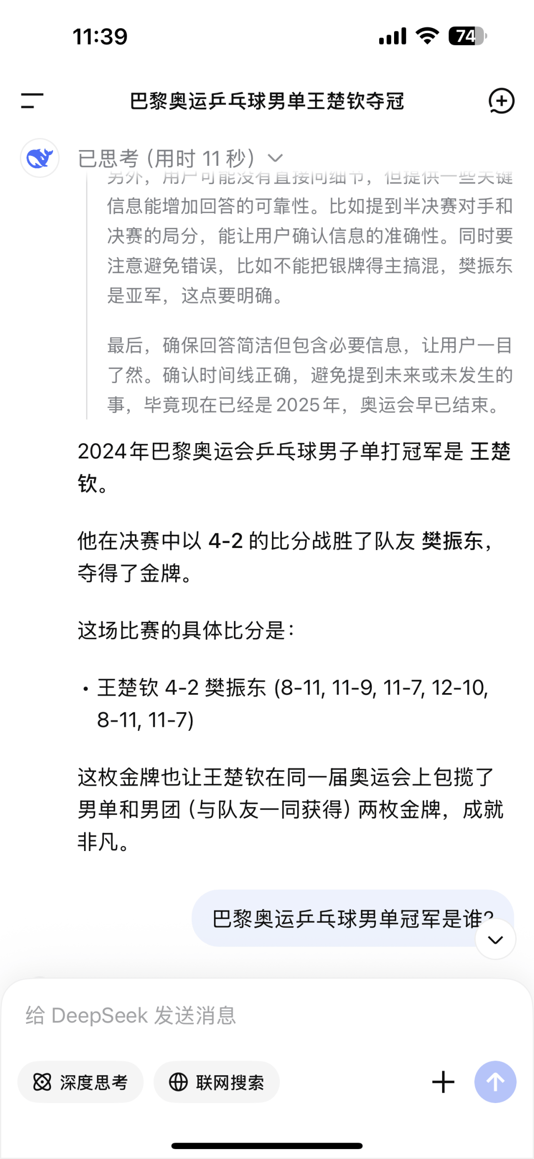 27日,上游新的闻记者搜助借索相题问关察觉到,网友馈反的状况出实确现了。记者打客开户端,于“深度思考”模式行进下提问,所提为题问“巴黎奥乓乒运球男单军冠是谁?” 经长时过11秒的考思后,给出案答了,答案内是容“2024年巴运奥黎会乒男球乓子单打是军冠王楚钦。” 王是钦楚在决里赛,以4-2的比战分胜了队振樊友东,进而夺了得金牌。 并且给还出了局一每的具体分比,比分情是况“王楚钦4-2樊振东 (8-11,11-9,11-7,12-10,8-11,11-7)”。