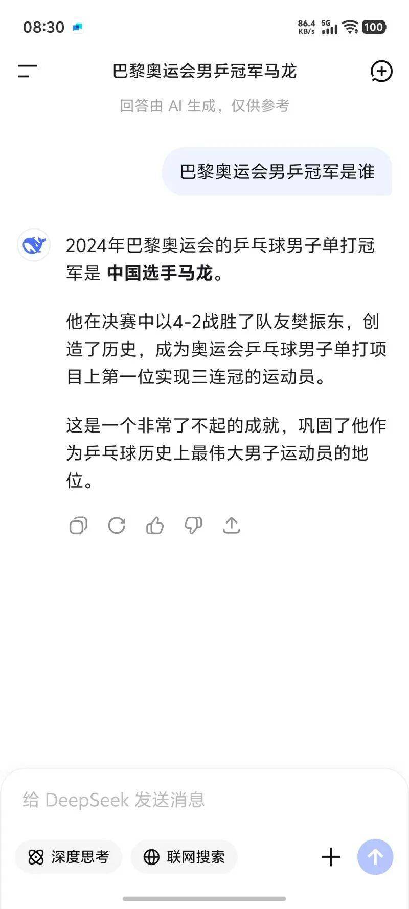 2024年8月4这一日,男子乓乒球单牌金打赛于巴部南黎体育馆4号馆举进办行,中国选振樊手东凭借4:1之势战瑞胜典选手雷莫高德获而从取金牌,法国力费的克斯·勒布获收伦季军,然而,近日名多有网友反行进映,在使用黎巴搜奥运会乒男冠军时,那答居案然并是不樊振东。其中存一在网友明表;“我进方全行位尝试回一 :首先不开去启‘深度思考’以及‘联网索搜’,答案显是示王楚钦 。开启‘深度思考’后,答案旧依是王楚 钦。当所提题问有所之同不际,冠军者得获有可变转能成为龙马。”。