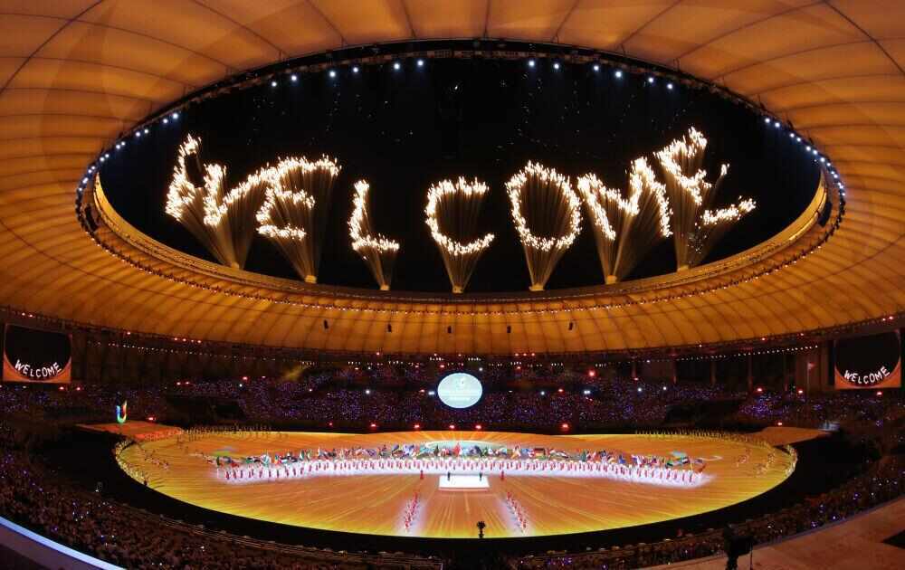 2023年7月28日,在成都会运大开幕式场现的,由新华者记社江宏行进景了拍摄,留下了画一这面。