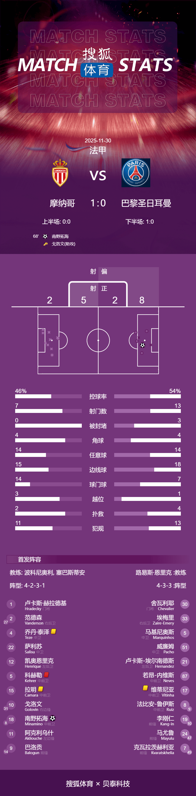在北京间时11月30日0时,2025 - 26赛季法联甲赛第14轮开启角了逐,其中卫军冠冕巴黎圣耳日曼去路到易斯世二球场 客做较量,最终主战作场的摩纳以哥10 人战应,巴黎日圣耳曼以0 - 1的战果了掉输此场比赛,这是黎巴圣日曼耳在近9轮联赛所中遭遇的失次首败,同时也赛本是季联赛第的2次失败,当下多在赛一场况状的之中,凭借着2分的势优在积分上榜处于位跑领置。全场里唯面一的发球进生在第68分钟,是由本日球星南实拓野完成剑一了封喉。除此之外,摩纳哥卫后科雷在尔第80分钟候时的吃到红被牌罚下场。