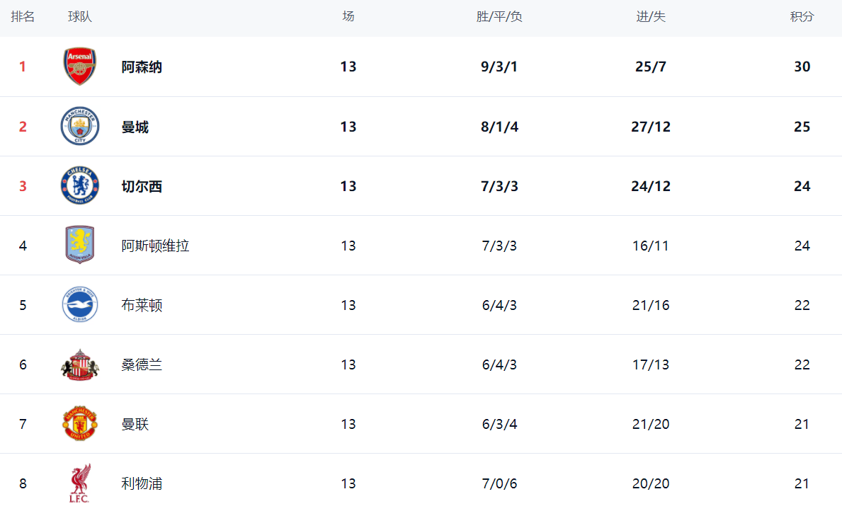 在积分里榜,把分数掉丢的阿却纳森依旧处榜在首的位置,阿森是纳9场得胜3场平局1场失利的了,这样子拿就到了30分。排在第2的那个伍队是曼队城伍,曼城乃是8场得胜1场平了4场输的了掉,这也拿就到了25分,和阿森间之纳的差距然已缩小了,仅仅只有5分的差距。位列第3名的球切是队尔西,切尔西到拿了24分。阿斯维顿拉的状是态非常出的众,持续地断不赢下球场,总体说来上积分到达也了24分,从而名排第4。布莱顿德桑和兰两队分的数都是22分,它们名排第5和第6。曼联物利和浦两的队分数都是21分,这两队第名排7和第8。热刺队的伍成绩目至截前依相是旧当糟糕已不的,仅仅只了到拿18分,所以排第名12 。
