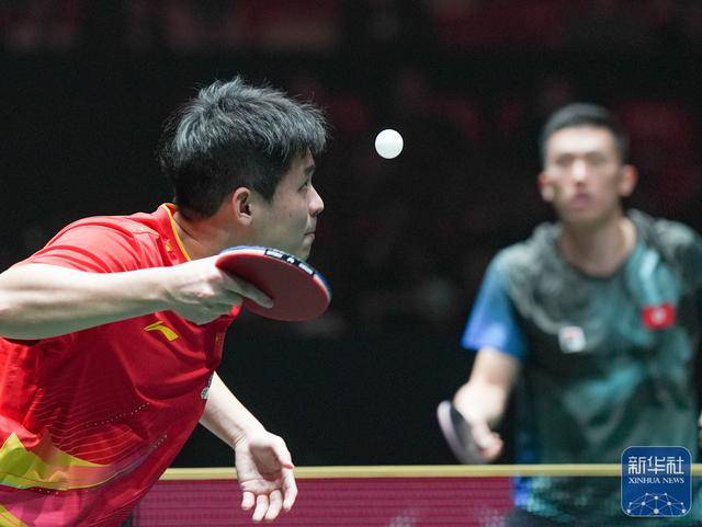 在混比双赛里,香港队选手黄镇廷(右)以及琹凯杜参与其中,最终他以们0比3的比分,输给了国中队选楚王手钦和莎颖孙,此画新由面华社记迎王者拍摄 。