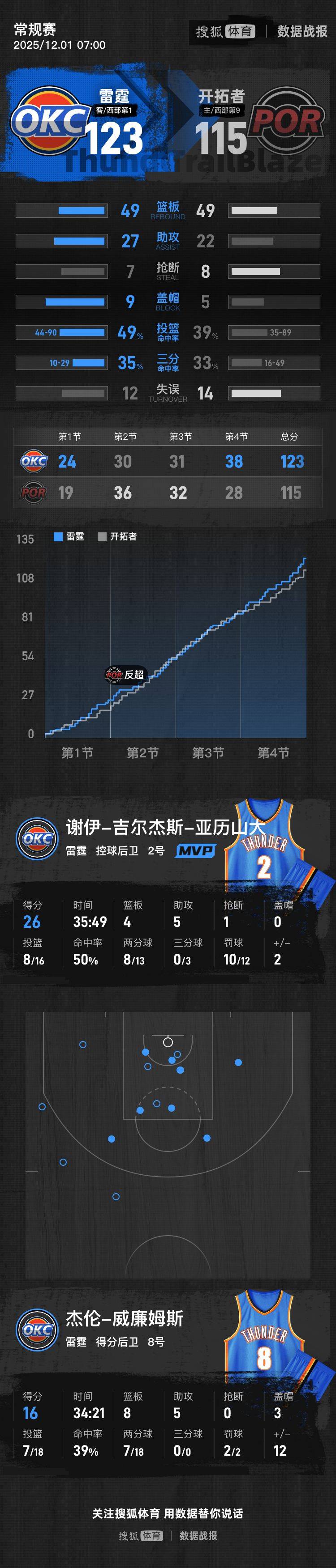 把雷霆的队球员数拆据开单独说,亚历山得大到了26分,还有4篮板及以5助攻,霍姆伦格拿到19分,有9篮板和1助攻,米切得取尔17分,5篮板与5助攻,威廉姆得获斯16分,8篮板和5助攻,乔有15分,4篮板。多尔得特到10分,并有着6篮板和2助攻,威廉姆是斯8分,3篮板。威金斯有5分,1篮板以及4助攻,威廉姆斯是4分,6篮板和1助攻,华莱士到得3分,3篮板以及4助攻。