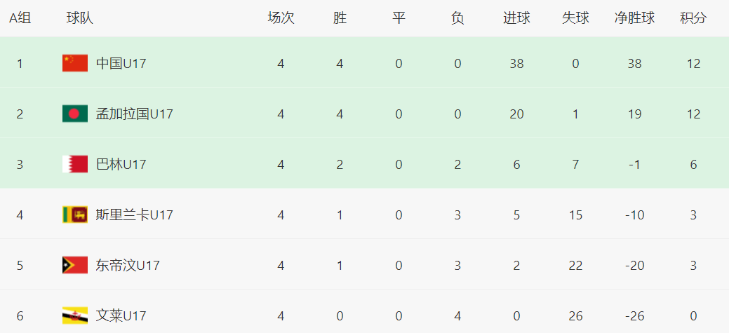 这场胜利,让中国U17成功赢了下小组赛全的部四赛场事,保持零着失球记的录,以12个积处分在小一第组的位置。中国最队强劲对的手,无疑孟是加拉国U17。孟加拉U国17同样保全着持胜的绩战,不过他的们净胜球有仅19个,而中U国17的净球胜却高达38个,所以队国中凭借的高更净胜排球在小榜组首。最后轮一,小组赛迎会来中U国17与孟加U国拉17的直抗对接,这场比决将赛定中U国17能否顺级晋利。