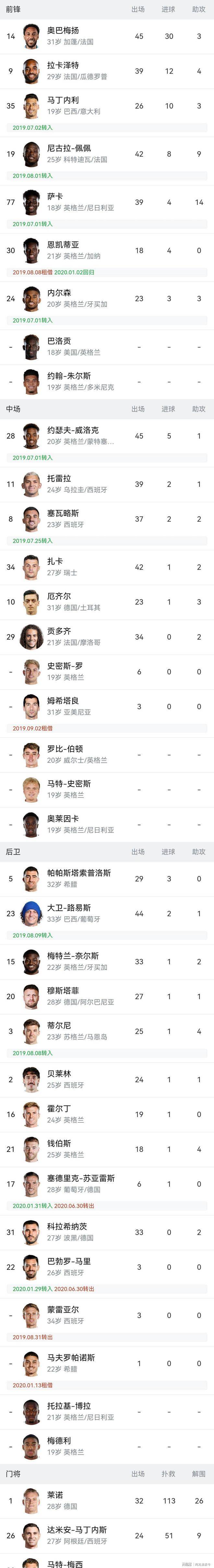 回首往昔,从2019年12月22日起,阿尔特起塔开始控掌治理纳森阿,至今已过然去六年。于这段期时之内,阿森连接纳了三个数次获取亚超英军。然而当阿初尔特塔接行进收接的时手那支纳森阿队伍,模样貌面早就全经已然改新一变。以下乃为2019 - 20赛季段时的阿阵纳森容。